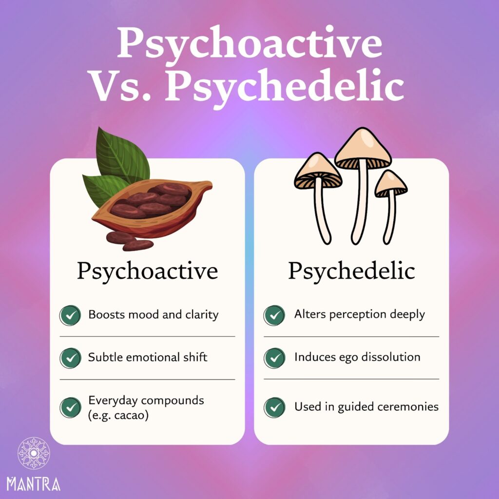 To put it simply, anything that changes our perceptions or senses in any way is a psychoactive substance. The caffeine in your coffee is one. So are the mushrooms in your ceremonial chocolate bar.