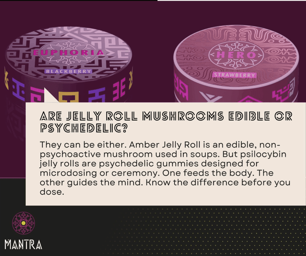 Pro tip: Not all products labeled “jelly roll” are psychedelic or safe. Some are only culinary fungi.